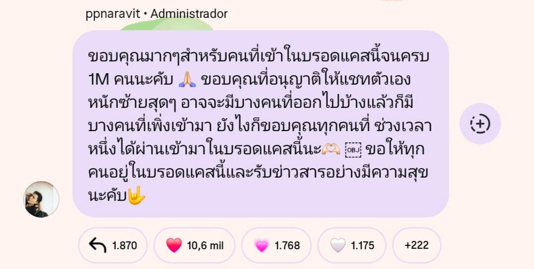 IG: ppnaravit"Muito obrigado a todos que entraram nesta transmissão e ao número de participantes que já ultrapassou 1 milhão! 🙏🏼 Obrigado por permitirem que o chat de vocês fique 'pesado no lado esquerdo'. Alguns podem ter saído e outros podem ter acabado de entrar na sala. De qualquer forma, obrigado a todos que passaram uma parte desta transmissão conosco 🫶🏼 Espero que todos se sintam entretidos aqui e que gostem de receber as notícias 🤟"