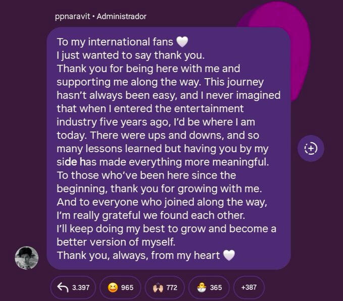 IG: ppnaravit"Para os meus fãs internacionais 🤍 Eu só queria dizer obrigado. Obrigado por estarem aqui comigo e por me apoiarem ao longo do caminho. Esta jornada nem sempre foi fácil, e eu nunca imaginei, quando entrei na indústria do entretenimento cinco anos atrás, que estaria onde estou hoje. Houve altos e baixos e tantas lições aprendidas, mas ter vocês ao meu lado fez com que tudo fosse mais significativo. Para aqueles que estão aqui desde o início, obrigado por crescerem comigo. E para todos que se juntaram a nós ao longo do caminho, sou muito grato por termos nos encontrado. Continuarei dando o meu melhor para crescer e me tornar uma versão melhor de mim mesmo. Obrigado, sempre, de todo o meu coração 🤍"
